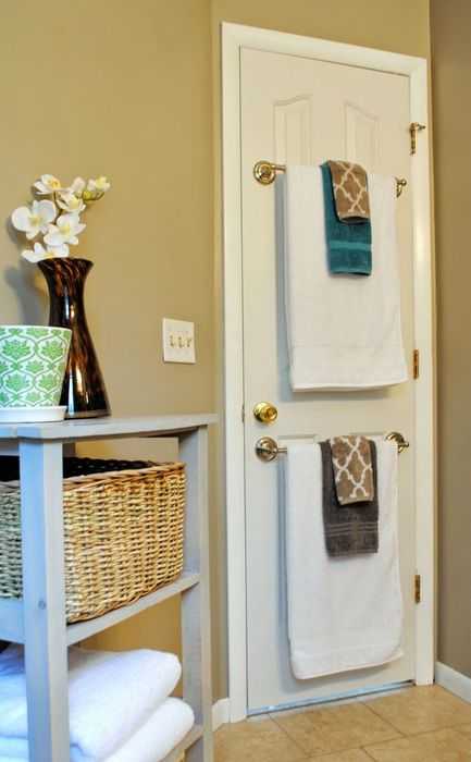 В оригинальную систему хранения легко превратить и обычную дверь. Стоит только закрепить на ней несколько штанг и повесить на них полотенца.