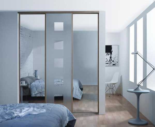 Если говорить о спальне, то её можно поделить на гардероб с туалетным столиком и зону для сна, для чего необходимо поставить кровать посередине комнаты и оставить по обе ее стороны проходы. В этом случае пространство над изголовьем можно завесить шторами. Изголовьем кровати может служить и обратная стенка шкафа, украшенная тканью или гобеленом. Подобный вариант зонирования спальни позволяет размещать за шкафом мини-гардеробную.