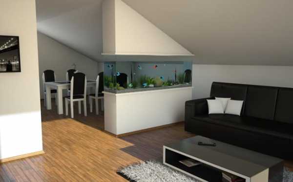 Выделить зоны можно с помощью разных уровней пола. Обычно на подиумах размещают кабинет, спальное место, место для комнатных цветов или аквариума.