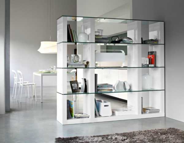 Стеллаж с отрытыми (сквозными) полками тоже станет превосходным «разделяющим» элементом. Он не будет загромождать пространство и при этом отлично справиться со своими дополнительными функциями.