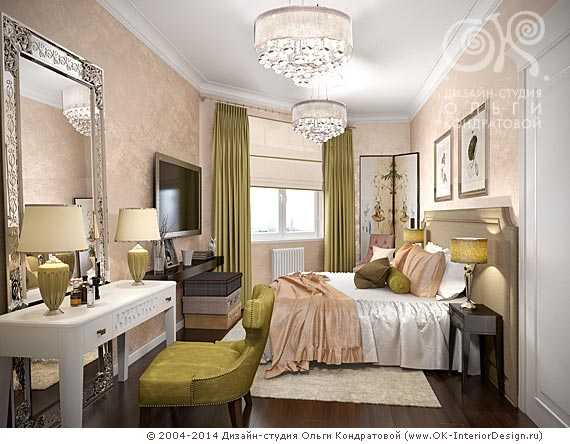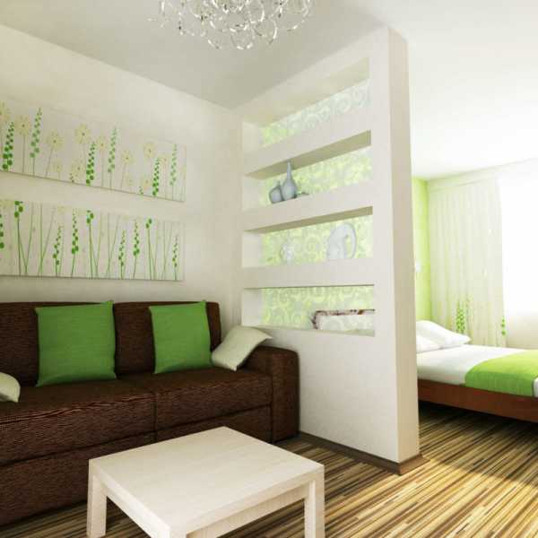 При желании зонировать в одной небольшой комнате гостиную и спальню, хорошим решением станет стена из гипсокартона, ограждающая кровать. Еще одним удачным вариантом будет наличие занавески перед кроватью или стеклянных дверей с занавеской.