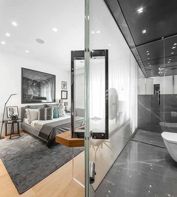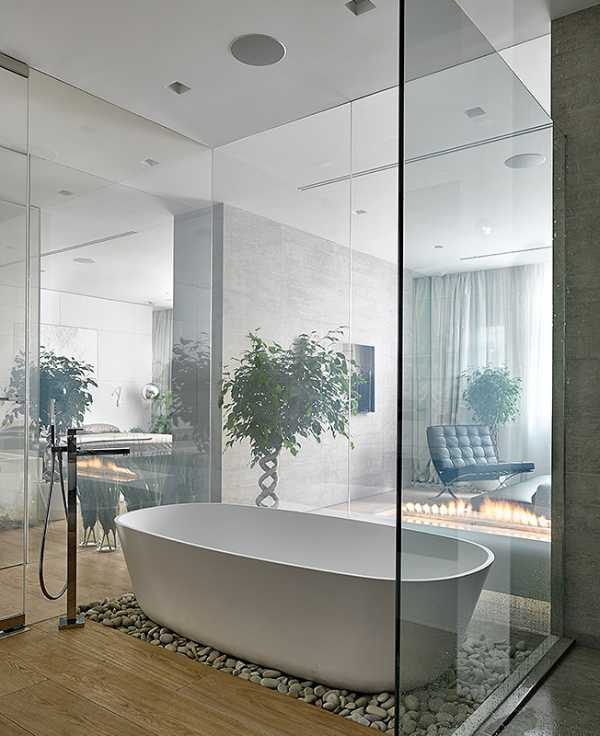 Проект Александры Федоровой. Ванная отделена от спальни прозрачным cмартстеклом, так что, лежа в воде, можно созерцать огонь в камине. Единое напольное покрытие усиливает ощущение цельности пространства.