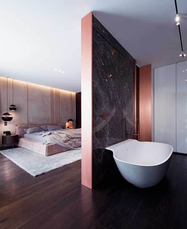 YoDezeen в Киеве. Спальня размещена в едином объеме с ванной. Их разделяет перегородка, отделанная мрамором сорта cipollino. Отдельно стоящая ванна Falper, диз. М. Шмидт. Медные элементы De Castelli.