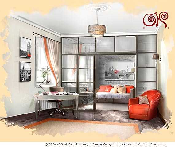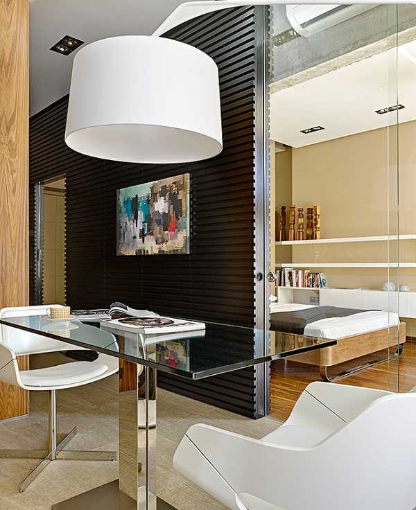 Стеклянные интерьерные перегородки различного дизайна популярны в современных жилищах. Стеклянная перегородка для зонирования комнаты имеет не только декоративное назначение, она еще и делит пространство на рабочую зону и зону спальни. Стекло очень выгодно применять при зонировании, оно режет пространство очень мягко, так как имеет свойство отражать свет, одновременно как бы увеличивая комнату.