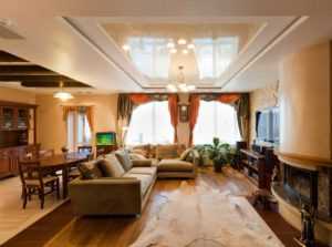 Многоуровневый потолок способен не только выделить отдельные зоны, но и эффективно скроет коммуникации при необходимости.