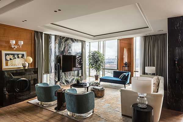 Катерина Лашманова. Интерьер полон интересных рифм: геометрия консоли Vanguard согласована с линиями настенного панно, формы «золотых» столиков перекликаются с рисунком паркета. Диваны The Sofa & Chair. Люстра Lindsey Adelman.