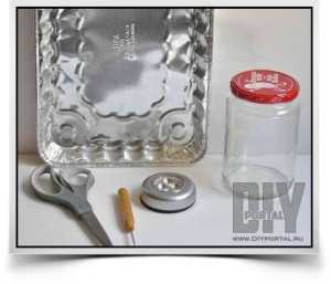 Для создания своими руками оригинального ночника “звездное небо” нам понадобится стеклянная банка, шило, ножницы, алюминевая фольга и дешевый китайский светильник на батарейках (главное, что бы диаметр светильника был чуть меньше диаметра нашей банки).
