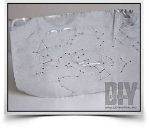 - Нанесите на фольгу звёздный узор с помощью иглы. Можно проделать хаотичные отверстия, а можно перенести заранее заготовленную схему реальных созвездий.